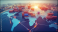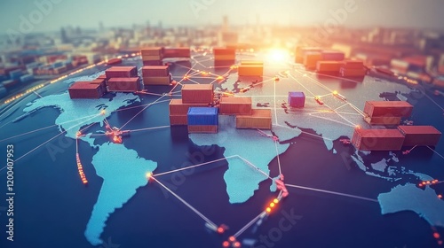 A digitally stylized image of shipping routes connecting continents on a globe, global freight network concept.