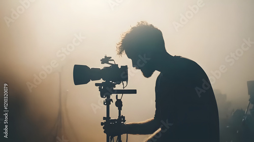 Fototapeta - Close-up of a film director adjusting settings on a high-end camera, showcasing the intricacies of filmmaking and the director’s control over the cinematic process.