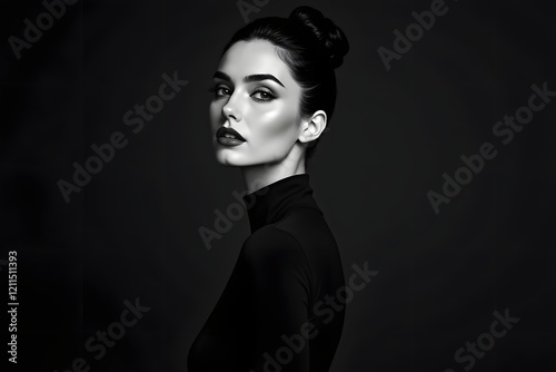 Black and white fashion art studio portrait of beautiful elegant woman in black turtleneck. Hair is collected in high beam.