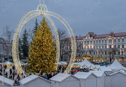 Fototapeta - Locals and tourists celebrating the Christmas Holidays of 2024 at the Cathedral Square in Vilnius Old Town, Vilnius, Lithuania