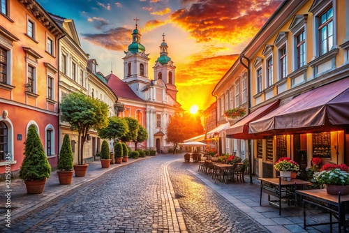 Fototapeta - Vilnius Old Town, Lithuania: Charming Cobblestone Streets and Historic Architecture at Sunrise