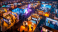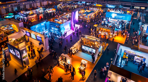 >Plakat>Aerial view of a bustling trade show or exhibition with numerous booths, attendees, and vibrant lighting creating a dynamic atmosphere of commerce and networking