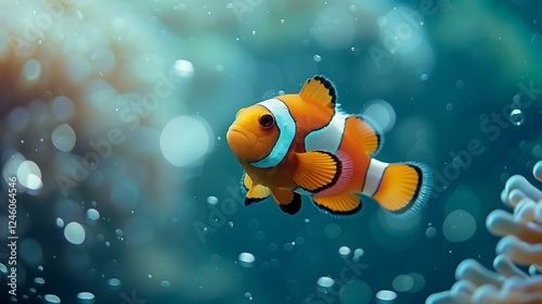 Fototapeta - Orange and White Clownfish Swimming in a Sparkling Ocean