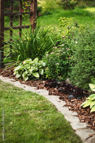 natural stone lawn edging and mulching flowerbeds in summer garden