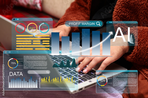 >Plakat>A woman's hands type on a laptop surrounded by AI-driven analytics, graphs and data visualizations. The image represents financial growth profit margin analysis business intelligence digital strategy.