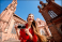 >Plakat>Young female tourist with photo camera standing in front of the famous gothic church in the old town of Vilnius. Woman having great vacations in Lithuania
