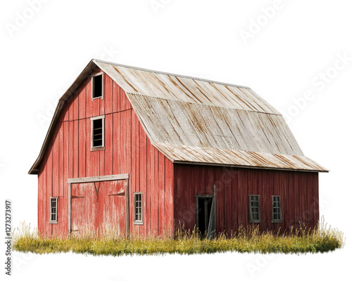 >Plakat>rustic red barn with weathered roof, surrounded by tall grass, evokes sense of rural charm and nostalgia. This iconic structure represents agricultural heritage and simplicity