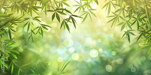 Fototapeta - Rozmyte zielone liście bambusa w promieniach słońca.