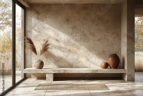 Fototapeta - Photographie immobilière d’une entrée moderne minimaliste avec banc élégant et décoration épurée. HDR, 3D, design, tendance, architecte
