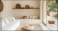 >Plakat>Salon bohème beige avec canapé blanc, tapis et paniers tressés sur une étagère. Aménagement intérieur minimaliste d'une pièce d'habitation moderne et épuré avec porte vitrée donnant sur jardin.