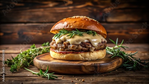 Fototapeta - Decadent gourmet burger with creamy foie gras toppings on a rustic wooden board plate