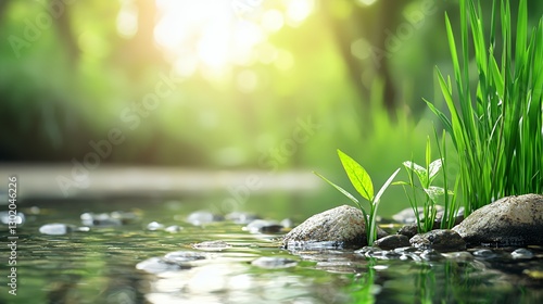 Fototapeta - New Plant Growth by a Sunny Stream