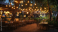 Fototapeta - Cozy outdoor restaurant illuminated with string lights at night