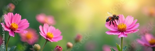 Beautiful background of blooming flowers with adorable bees pollinating, garden, bees