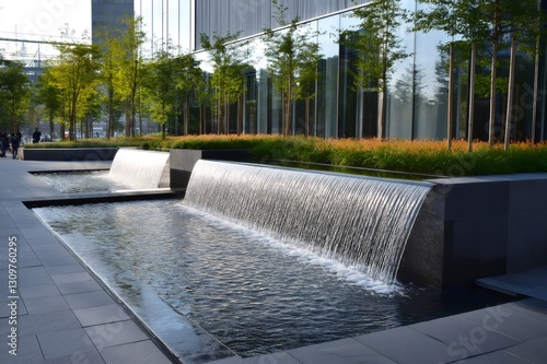 Relaxing water feature cascading into reflecting pool in a modern pedestrian square with office buildings and ornamental plants