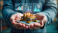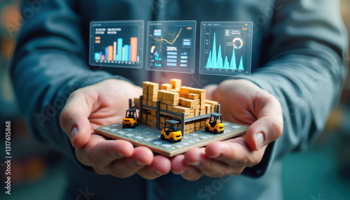 >Plakat>Hands holding warehouse with yellow forklifts and stacked boxes while digital analytics dashboards hover above. Supply chain management metrics with inventory statistics in holographic