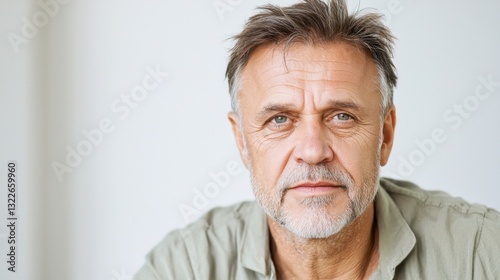 Fototapeta - The portrait depicts a middle aged man with a relaxed expression, wearing a casual shirt, and looking directly at the viewer