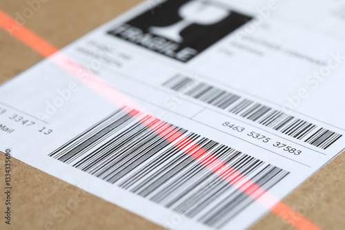 Fototapeta - Parcel with label, closeup. Red laser light on barcode for scanning