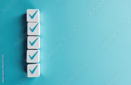 Fototapeta - Completed checklist on blue background. White cubes marked with blue ticks, task completion, readiness, compliance. Symbol for achievements, validation, confirmation for business, career projects.