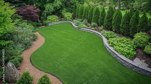 Fototapeta - aerial view garden landscape, manicured green lawn, curved grey stone edging blocks, fresh bark mulch border, lush green shrubs, geometric garden design, professional landscaping, ornamental bushes,