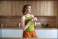 Fototapeta - Serene woman stands in kitchen holds coffee mug takes mindful pause, reflecting on goals, affirmations. Relaxed young female in casual homewear enjoys quiet, smiles softly sets optimistic tone for day
