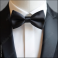 a minimalistic matte black bow tie with sharp edges, paired with a sleek modern tuxedo, clean lines, and elegant composition