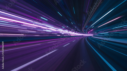 >Plakat>Abstract background in blue and purple neon glow colors. Panoramic high speed technology concept, light abstract background. Image of speed motion on the road.