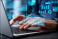 Data analytics and graphs. Analysis of statistical business marketing data. Data scientist using laptop computer to analyze data.