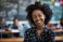 Fototapeta - Portrait of a young smiling African American female teacher in front of a classroom
