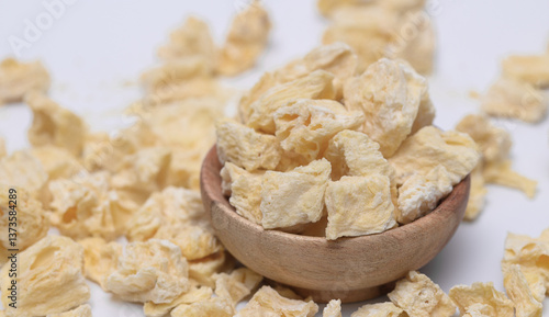 Fototapeta - Liofilizowany ananas w kawałkach, smaczna przekąska z owoców tropikalnych,