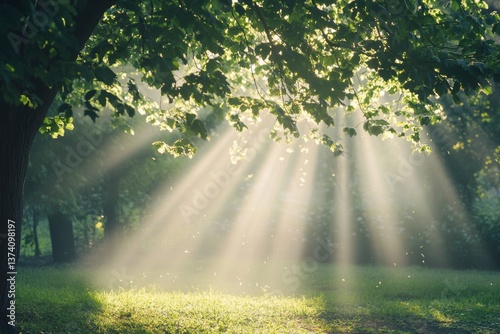 Fototapeta - peaceful outdoor scene with sunlight filtering through trees in summer part or nature, representing a healing journey, and leaving ample room for text