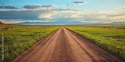 Fototapeta - A straight gravel road cuts through a wide green field under soft light. The open scenery evokes simplicity, stillness, and wanderlust. Ideal for travel or agricultural themes.
