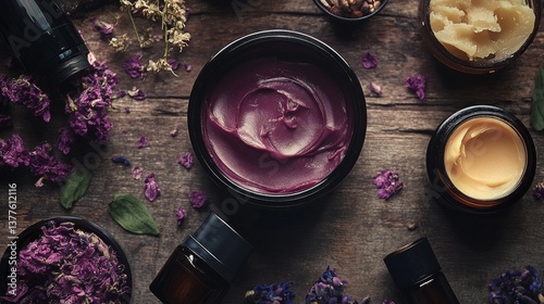Fototapeta - A collection of deeply nourishing hair butters and oils, artistically presented,