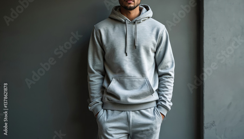 Man dressed in comfortable grey hoodie, sweatpants casual apparel. Urban lifestyle, relaxed fashion style. Versatile contemporary men clothing. Suitable for various scenarios, everyday wear or sports.