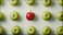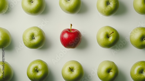 Outstanding red apple among green apples kitchen counter food photography minimalist style top-down view
