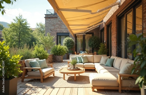 >Plakat>Sunny terrace features retractable awning stylish outdoor furniture plants. Comfortable modern living space with cozy inviting mood. Residential architecture decor on sunny day. Patio area with table