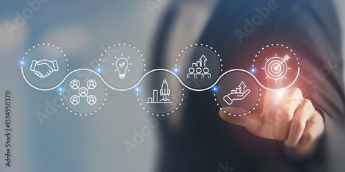 >Plakat>Business strategy concept. Touching screen on the icon representing business strategy elements; teamwork, partnership, innovation and technology, target and growth. Business goal acheivement.