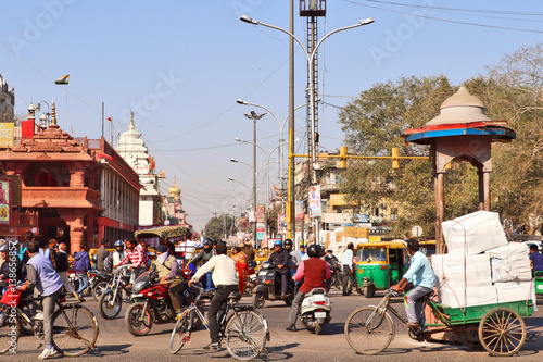 Fototapeta - Crowded and traffic packed world famous market Chandni Chowk situated in front of Historical Red Fort.
