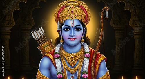 Detailed illustration of Lord Rama, Indian deity with bow and golden jewelry