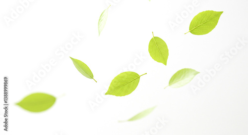 Fototapeta - 白背景に舞う緑の葉とコピースペースがあるナチュラルな背景