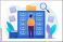 >Plakat>Flat vector illustration of an office worker searching digital archives in a file cabinet with blue folders, floating documents, and magnifying glass icon, representing data organization