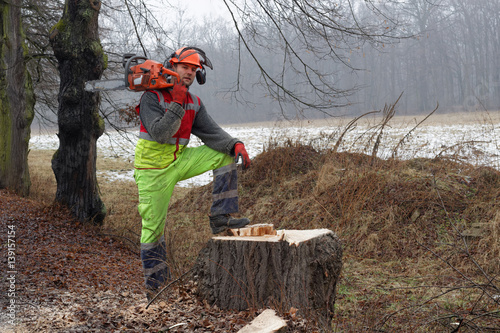 Fototapeta - Drwal arborysta stoi z pilarką łańcuchową spalinową