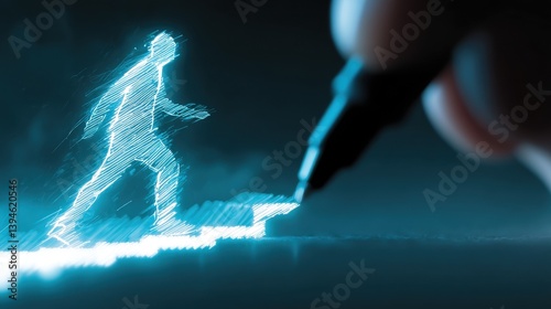 Fototapeta - A glowing holographic figure moves forward symbolizing the transformative power of digital innovation and the boundless potential of emerging technologies