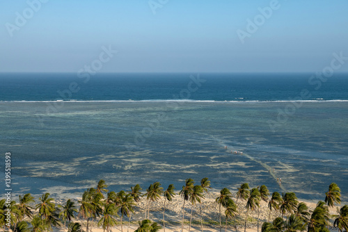 Fototapeta - laguna z plażą porośnięta palmami i rafą koralową na horyzoncie