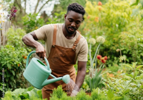 Fototapeta - Young African American man watering plants in a lush garden