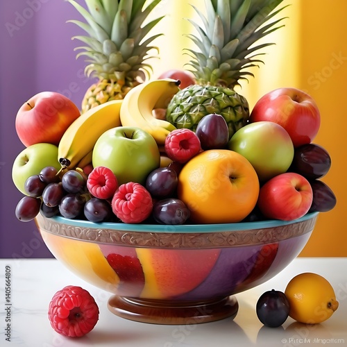 Fototapeta - A colorful fruit bowl overflowing with exotic fruits