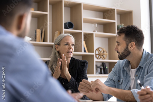 Fototapeta - Speaking from experience. Seasoned older adult businesswoman in formal suit lead business training for young corporate team colleagues share knowledge explain ideas to department staff during workshop