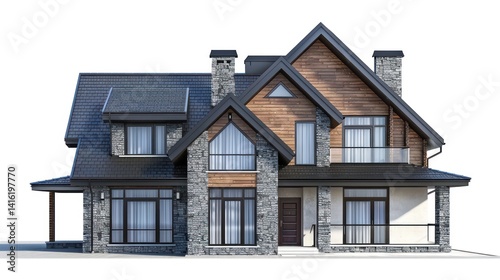 Fototapeta - image of a two story house with modern architecture style and roof with gables. House is made of brick with stone portions. 2d image front elevation with a white back ground