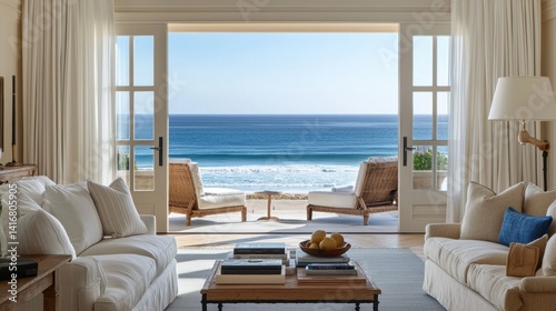 Ocean view from bright, luxurious living room, open doors onto outdoor seating area