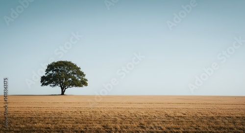 Fototapeta - Solitary tree in an open field under a pale blue sky, peaceful minimalist nature scene